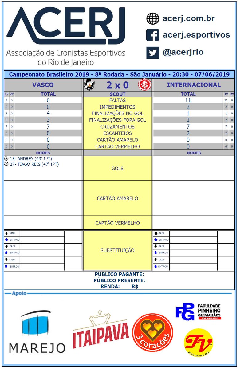 Scout do 1º Tempo de Vasco e Internacional pela 8ª Rodada do Campeonato Brasileiro 2019 em São Januário #acerjinforma #VASxINT #Brasileirão2019
