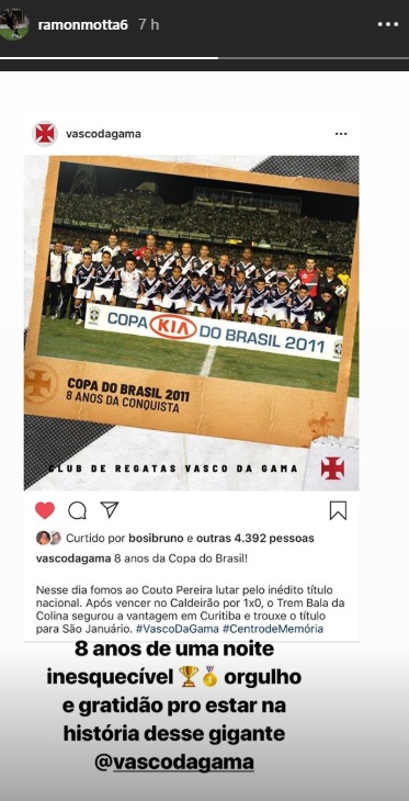 No Instagram, Ramon relembra título da Copa do Brasil: '8 anos de uma noite inesquecível'