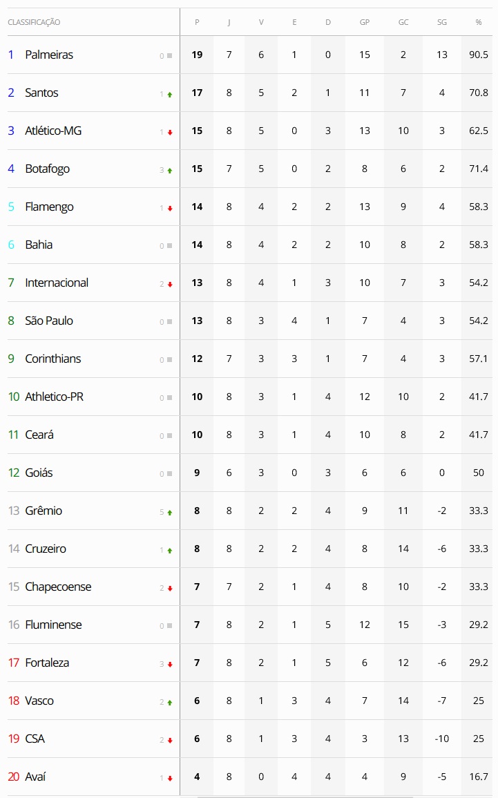 Faltando 1 jogo para o fim da 8ª rodada do Campeonato Brasileiro, o Vasco, que derrotou o Internacional por 2 a 1, subiu da 20ª para 18ª colocação na tabela. O Gigante da Colina está 1 ponto atrás do 16ª colocado, que é o 1º time fora do Z4. O jogo que encerra a rodada nesta 2ª-feira, Goiás x Chapecoense, não influenciará na colocação do Vasco.