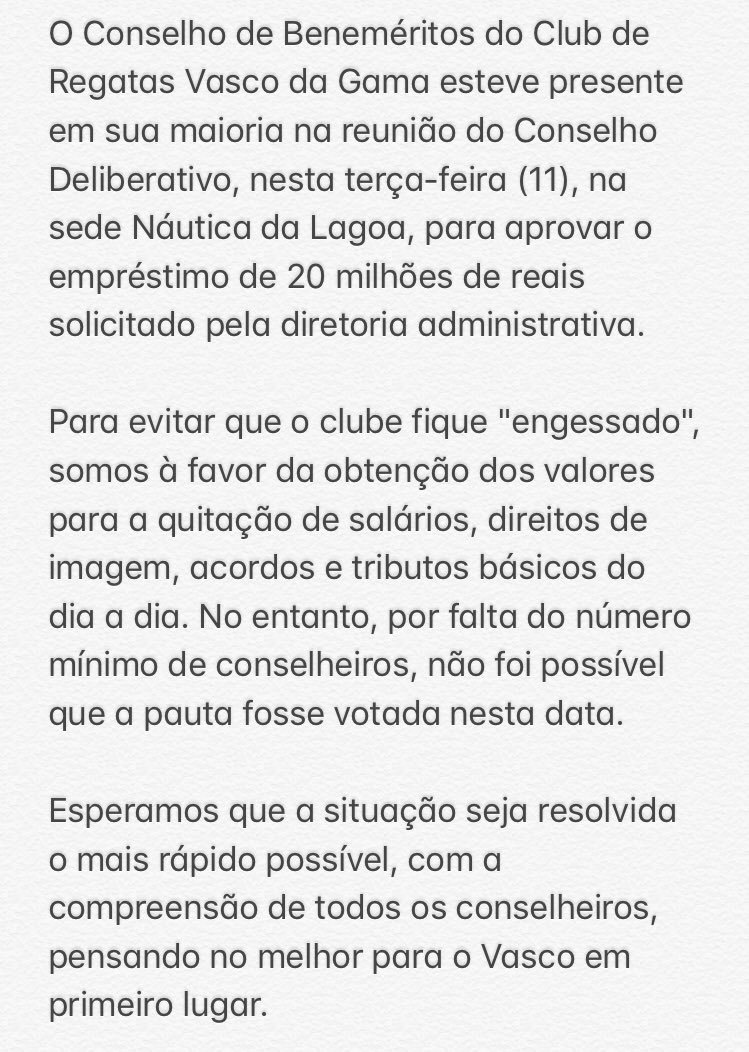 O Conselho de Benemeritos emitiu nota oficial após a reunião cancelada por falta de quórum no Conselho Deliberativo hoje à noite no Vasco. Leia! #FutGloboRadio