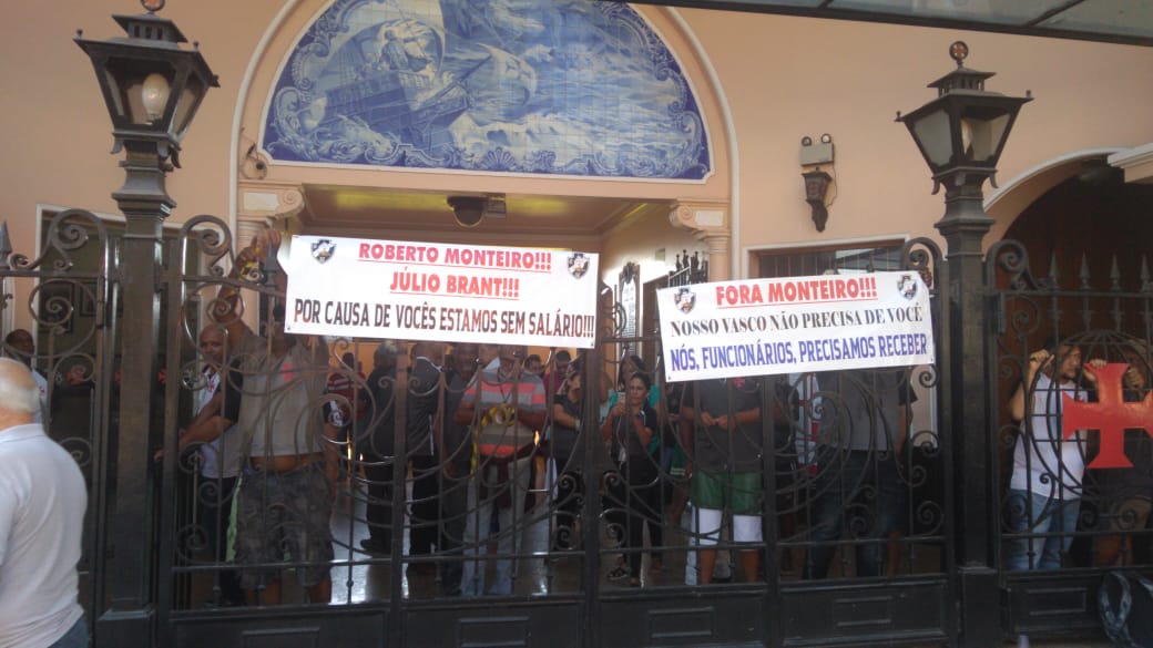 Funcionários penduram faixas contra Roberto Monteiro e Julio Brant na entrada de São Januário