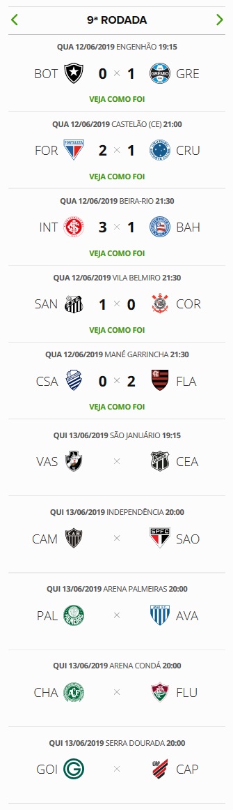 Os resultados de 4ª-feira, pela 9ª rodada do Campeonato Brasileiro, deixaram o Vasco na seguinte situação: