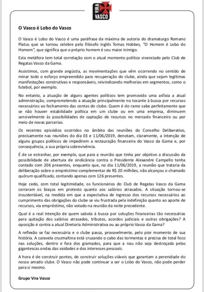 Vira Vasco divulga nota sobre reunião do CD cancelada e greve dos funcionários do clube