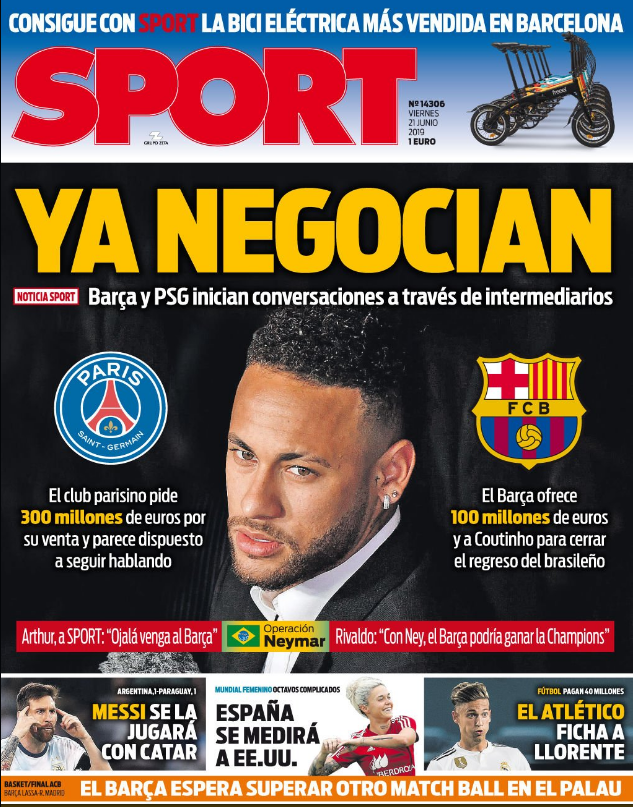 Nesta sexta-feira, enquanto o diário espanhol destaca que Coutinho prefere o clube francês, o 'Sport' destaca que o PSG e o Barça negociam o retorno de Neymar à Espanha.