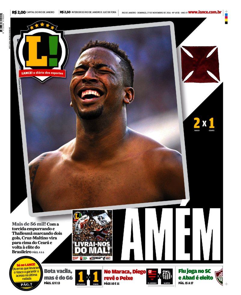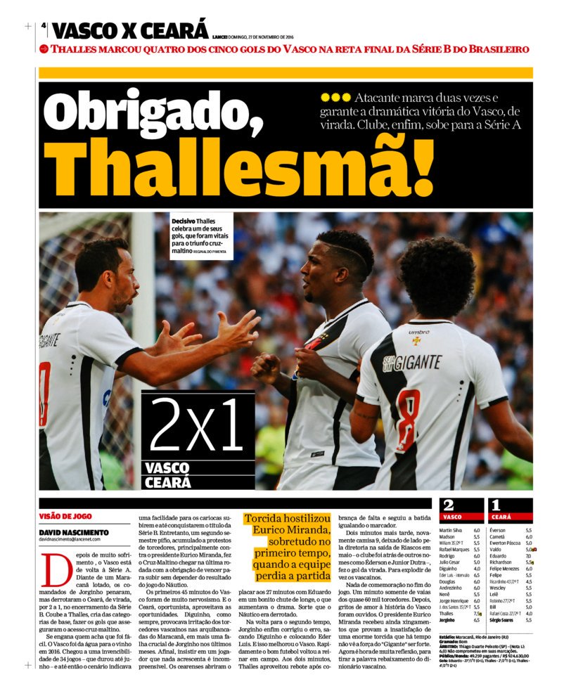Thalles fez o gol que selou a volta do Vasco à Série A em 2016; relembre capa de jornal do dia seguinte