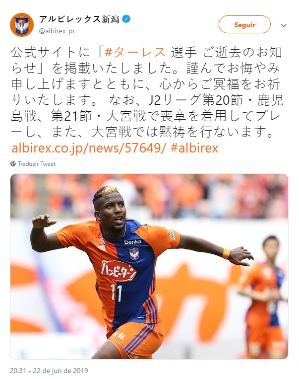 Penúltimo clube de Thalles, Albirex Niigata-JAP lamenta morte do jogador e informa que atuará de luto