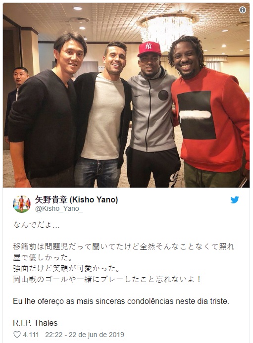 "Antes de se transferir, ouvi dizer que era um garoto problemático, mas era gentil e tímido. Nunca vou esquecer o gol do jogo em Okayama em que jogamos juntos!", postou Yano no Twitter, antes de finalizar em português: "Eu lhe ofereço as mais sinceras condolências neste dia triste".
