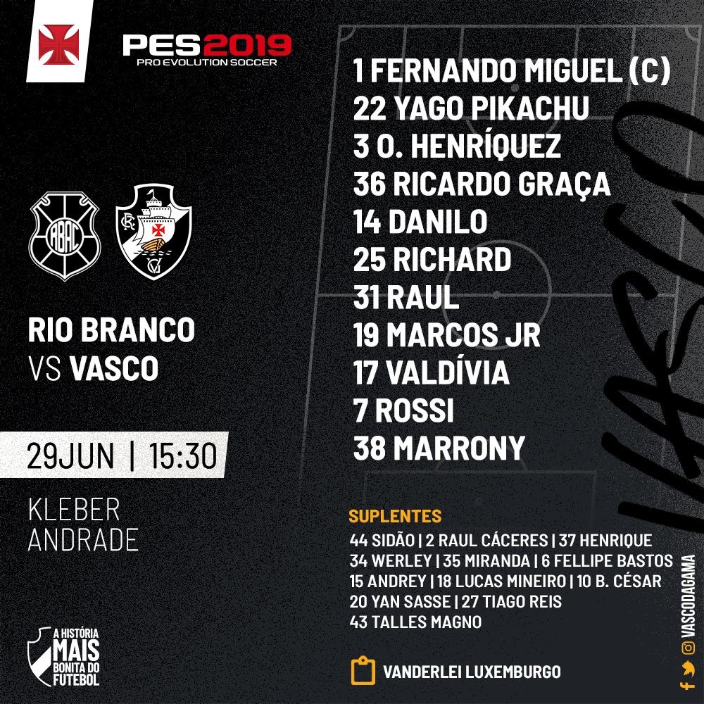 Vasco confirmado para o amistoso contra o Rio Branco-ES. Luxemburgo repete o time que treinou na sexta com Marco Júnior no lugar de Marquinho, que ficou no Rio #gevas
