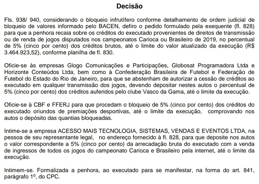 O Vasco sofreu na noite desta quarta penhora de R$ 3.464.923,52, a favor da "Biosanear Serviços Eirele". A juíza Katia Bugarim, 42a Vara Cível TJRJ, ordenou que 5% da renda dos ingressos dos jogos e do valor a receber pelas transmissões seja depositado em juízo. Espia #lanceVAS