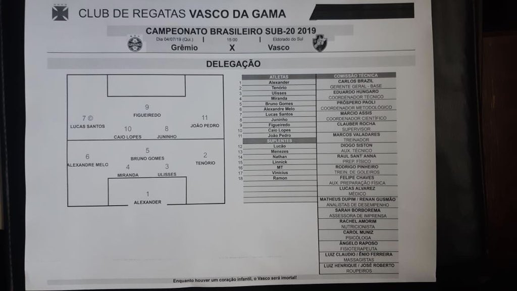 Vasco escalado para enfrentar o Grêmio-RS, pela 2ª rodada do Brasileirão Sub-20, em Eldorado do Sul-RS: Alexander; Cayo Tenório, Ulisses, Miranda e Alexandre Melo; Bruno Gomes, Caio Lopes e Juninho; Lucas Santos(C), João Pedro e Figueiredo; Técnico: Marcos Valadares #VASxGRE