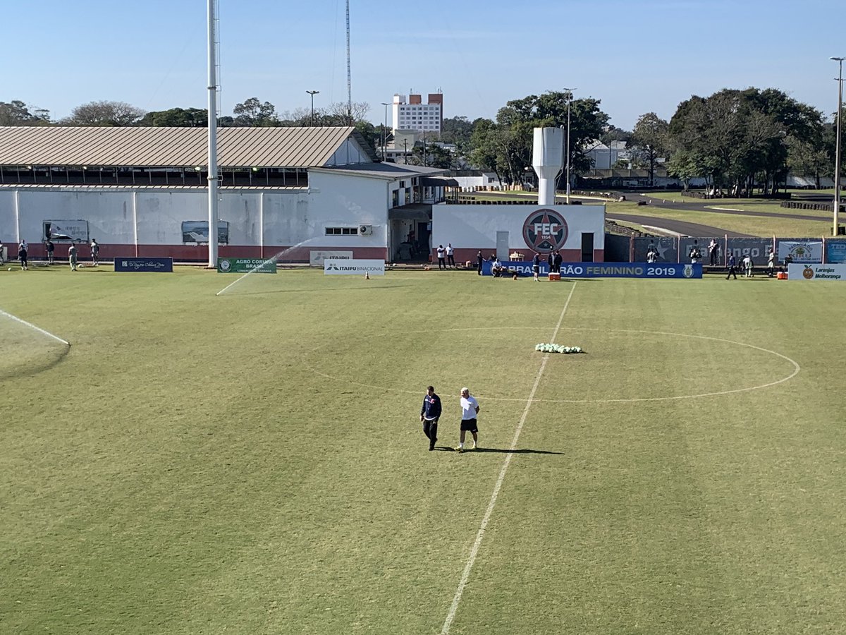 Luxemburgo e Antonio Mello conversam no centro do gramado em Foz do Iguaçu