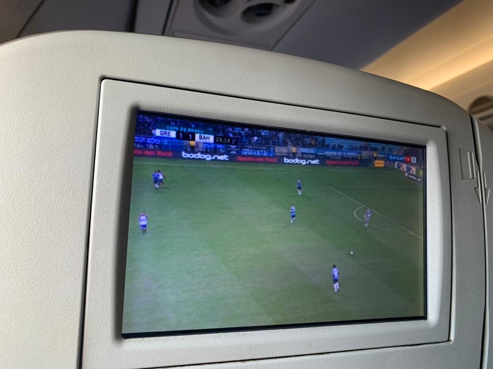 No encosto de cada assento, uma televisão com diversas opções de programas, séries e filmes transmitia, no SporTV 3, o empate em 1 a 1 entre Grêmio e Bahia, disputado na última quarta-feira, também em Porto Alegre, pela Copa do Brasil. Os jogadores já haviam assistido à partida durante a semana e tiveram mais 50 minutos, tempo de voo, para acompanhar o jogo.