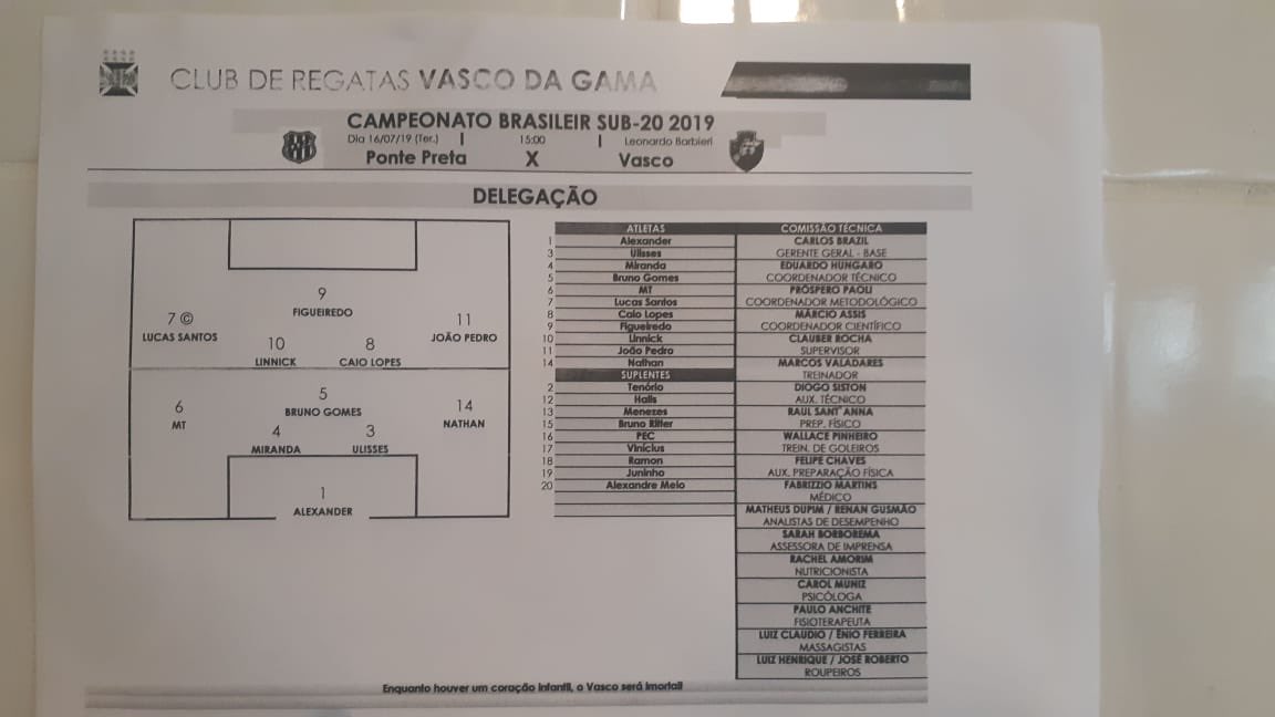 Sub-20: Escalação da Ponte Preta para enfrentar o Vasco, pelo Brasileirão Sub-20: Guilherme; Matheus, Gabriel Norões, Juan Henrique e Ryan; Vinicius, Danrley e Rogério; Andrey, Igor Maduro e Lyncon.