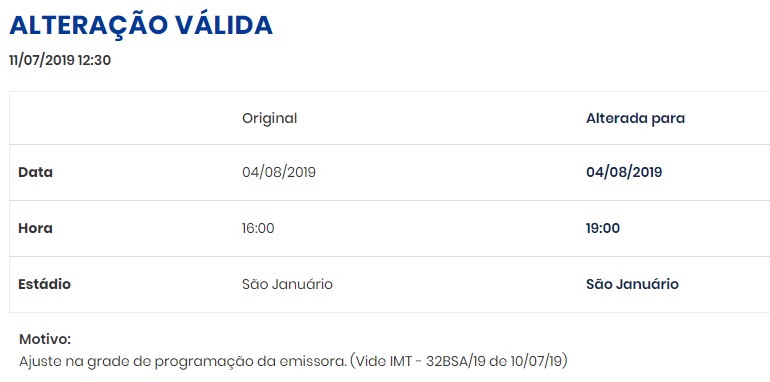 No dia 10/07 a CBF publicou a alteração do horário de Vasco x CSA, marcado para o dia 04/08, em São Januário, de 16 para as 19 horas. O motivo apresentado foi "Ajuste na grade de programação da emissora".