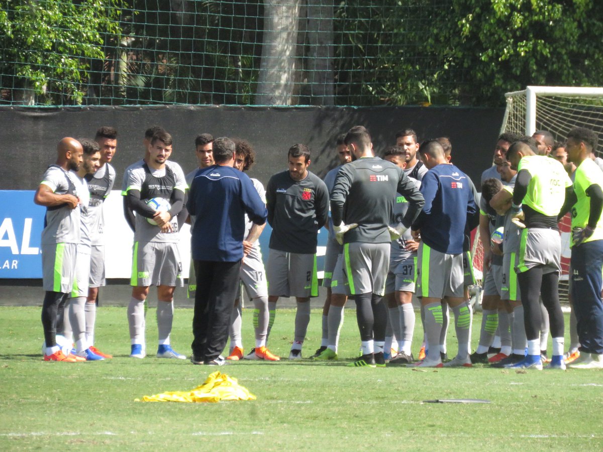 Fim do coletivo. Agora os jogadores iniciam trabalhos técnicos. Luxa treina de um lado com os zagueiros. Do outro, atacantes praticam finalizações. #gevas