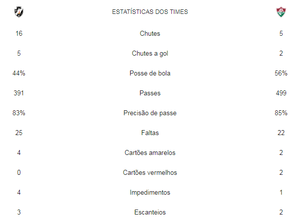 Nos minutos finais, o time de São Januário apenas passou a administrar a vantagem, enquanto o Fluminense ainda desperdiçou a última oportunidade com Brenner que recebeu na entrada da área e mandou por cima do travessão.