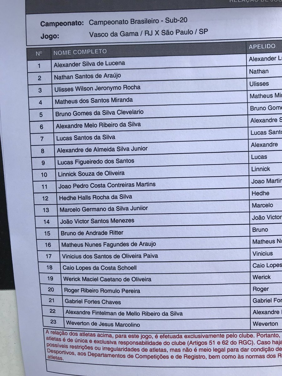 Vasco escalado para enfrentar o São Paulo, pelo Brasileirão Sub-20, em São Januário: Alexander, Nathan, Ulisses, Miranda e Alexandre Melo; Bruno Gomes, Juninho e Linnick; João Pedro, Lucas Santos(C) e Figueiredo. Técnico: Marcos Valadares