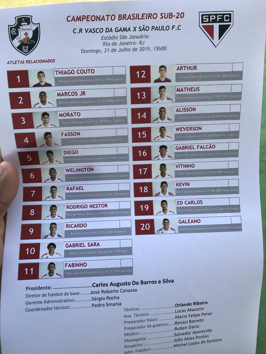 São Paulo escalado para enfrentar o Vasco, pelo Brasileirão Sub-20: Thiago Couto, Marcos Jr, Morato, Fasson, Diego e Welington; Rafael, Rodrigo Nestor e Gabriel Sara; Ricardo e Fabinho. Técnico: Orlando Ribeiro.