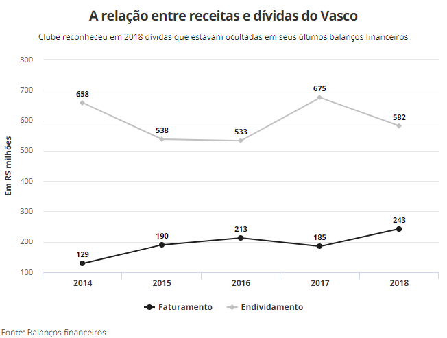 A chegada da nova auditoria também ajuda a entender, agora entrando de vez nos números, por que o endividamento do Vasco disparou no ano de 2017 em relação ao que vinha sendo informado. Conforme a diretoria de Campello levantou tapetes e abriu armários, encontrou e contabilizou dívidas que não tinham sido reconhecidas em balanços anteriores.