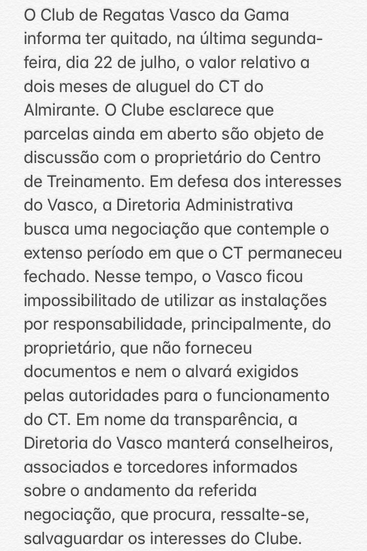 Vasco se pronunciou através de nota oficial sobre o atraso no pagamento do aluguel do CT do Almirante. #lanceVAS