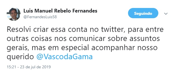 Resolvi criar essa conta no twitter, para entre outras coisas nos comunicar sobre assuntos gerais, mas em especial acompanhar nosso querido @VascodaGama