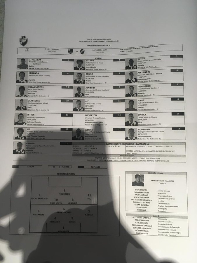 Escalação oficial do Vasco para enfrentar o Flamengo, às 21h30, no Raulino de Oliveira: Alexander, Nathan, Ulisses, Miranda, Alexandre Melo; Bruno Gomes, Juninho e Caio Lopes; Gabriel Pec, Figueiredo, Lucas Santos (C);