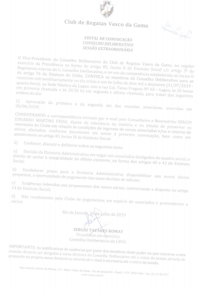 Confira a íntegra da convocação do Conselho Deliberativo: