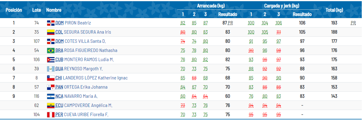 O pódio foi composto pela representante República Dominicana, Beatriz Piron, que estabeleceu um novo recorde Pan-Americano, com o ouro. Ana Segura da Colômbia ficou com a prata e Santa Coste, também da República Dominicana, com o bronze.