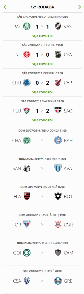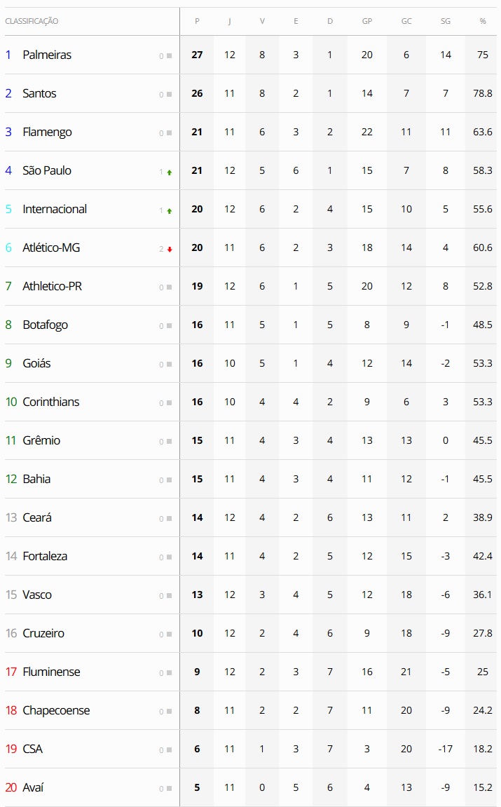 Com os resultados deste sábado do Campeonato Brasileiro, já está definido que o Vasco, que empatou com o Palmeiras por 1 a 1, terminará a 12ª rodada em 15º lugar, mesma posição em que figurava ao fim da rodada anterior.