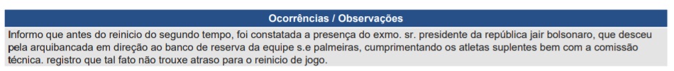 Árbitro diz na súmula que presença de Bolsonaro no gramado não atrasou reinício de Palmeiras x Vasco