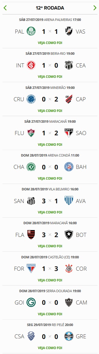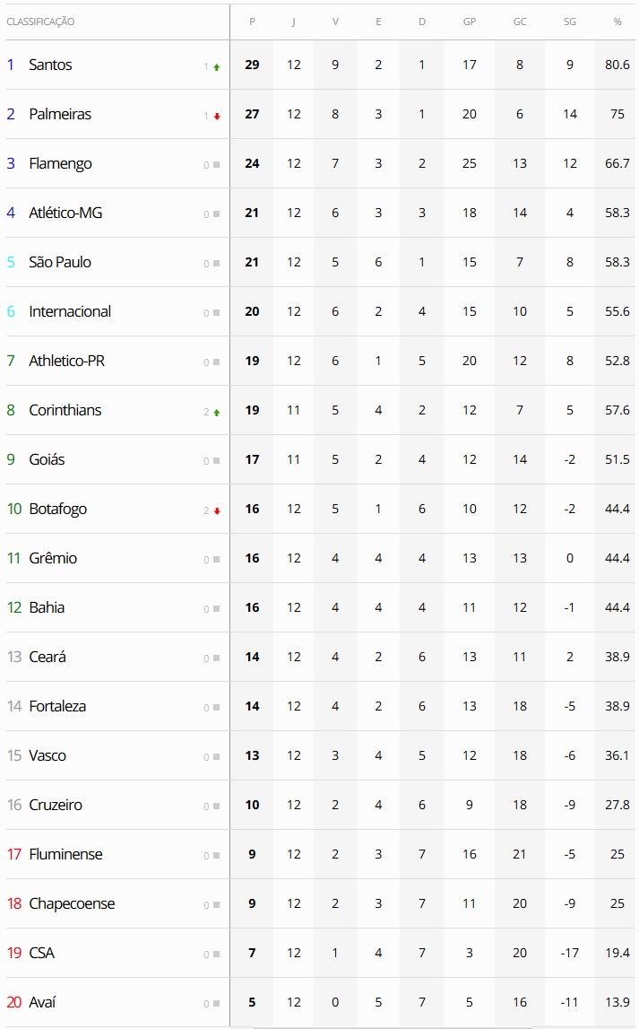 Terminada a 12ª rodada do Campeonato Brasileiro, o Vasco, que empatou com o Palmeiras por 1 a 1, manteve-se na 15ª colocação.