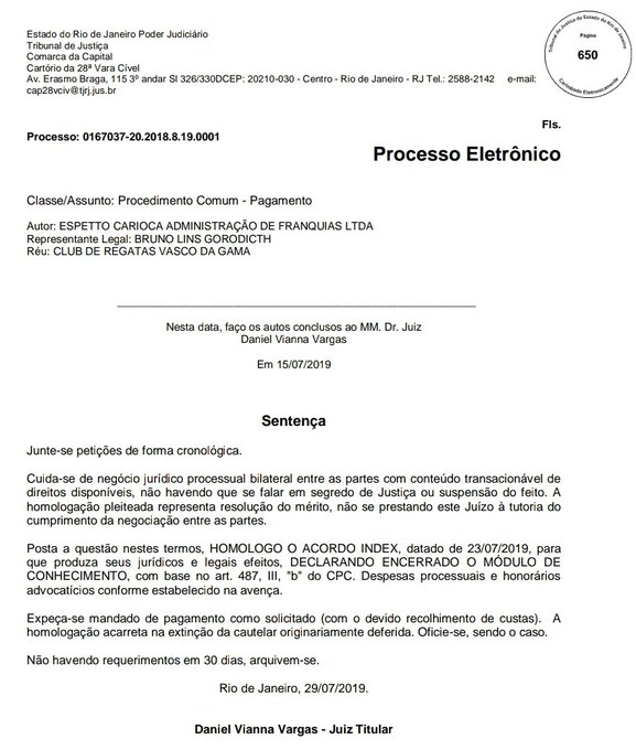 O Vasco entrou em acordo com a Espetto Carioca e, com isto, encerrou o processo judicial entre as partes, resolvendo o mérito. Os termos foram homologados pelo juiz Daniel Vianna Vargas, 28a Vara Cível TJRJ. O valor de R$ 1.054.410,79 foi liberado pelo magistrado. Espia #lanceVAS