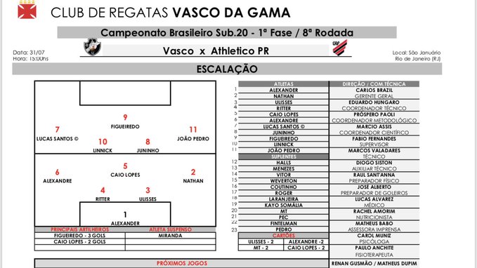 Vasco escalado para enfrentar o Athletico Paranaense pelo Brasileirão Sub-20, às 15h, em São Januário: Alexander, Nathan, Ulisses, Bruno Ritter e Alexandre Melo; Caio Lopes, Linnick e Juninho; Lucas Santos(C), João Pedro e Figueiredo; Técnico: Marcos Valadares.