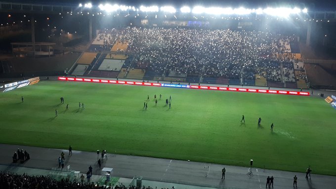 Apenas os refletores no lado onde ficam as cabines de imprensa que estão apagados. Torcedores fazem festa com as luzes dos celulares. #trcariacica