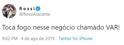 Rossi, via Twitter: 'Toca fogo nesse negócio chamado VAR!'