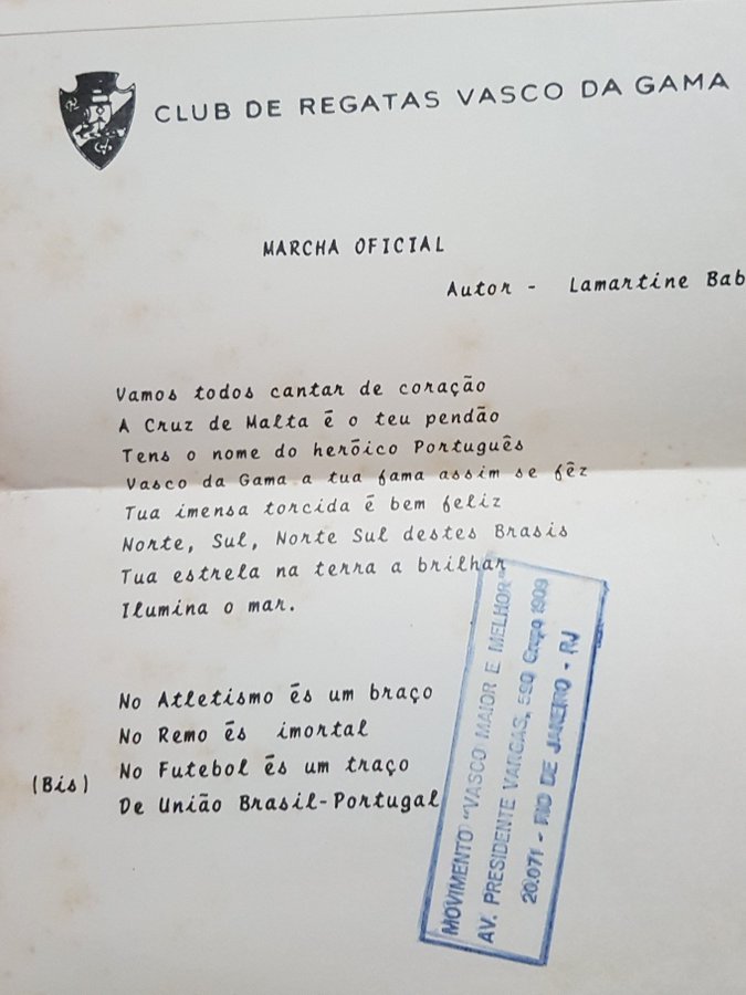 Documento mostra que verso correto no hino do Vasco é 'Norte Sul, Norte Sul destes Brasis'