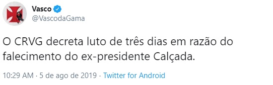 05/08/19 - Vasco publica nota de falecimento de Antônio Soares Calçada