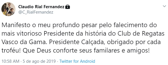 05/08/19 - Vasco publica nota de falecimento de Antônio Soares Calçada