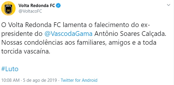Via Twitter, Volta Redonda lamenta o falecimento de Antônio Soares Calçada