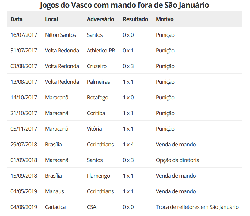 Desde 2017, o Vasco disputou 12 partidas como mandante em estádios diferentes de São Januário. Houve apenas uma vitória: 1 a 0 sobre o Botafogo no Maracanã no dia 14 de outubro de 2017. Além disso, são sete empates e quatro derrotas.
