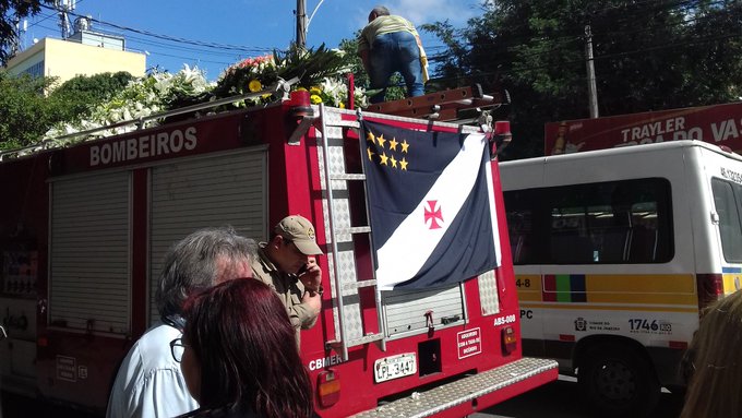 Carro do Corpo de Bombeiros ganhou uma bandeira do Vasco para homenagear o ex-presidente Calçada. Mas seu corpo não irá nesse carro. Não foi possível prender o caixão no teto do veículo. Corpo seguirá no carro da funerária para o cemitério São João Batista. #gevas