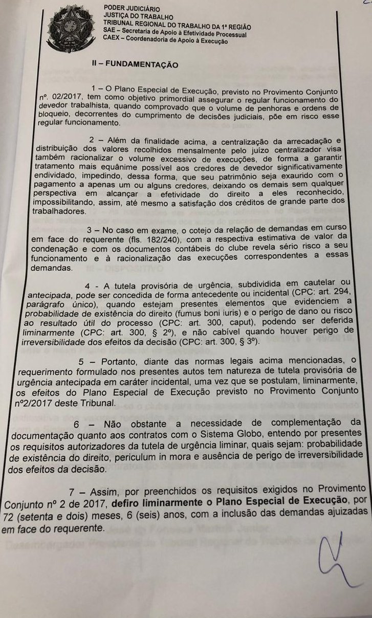 As páginas da decisão assinada pelo desembargador presidente do Tribunal Regional do Trabalho da Primeira Região, José de Fonseca Martins Junior, aprovando o novo ato trabalhista do Vasco. Espia a decisão na íntegra abaixo - a reportagem completa está no @lancenet