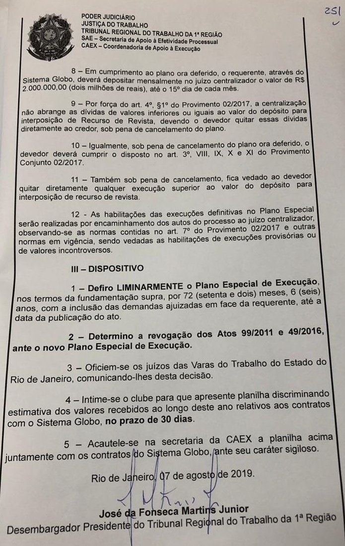 Veja a íntegra da decisão do novo ato trabalhista obtido pelo Vasco