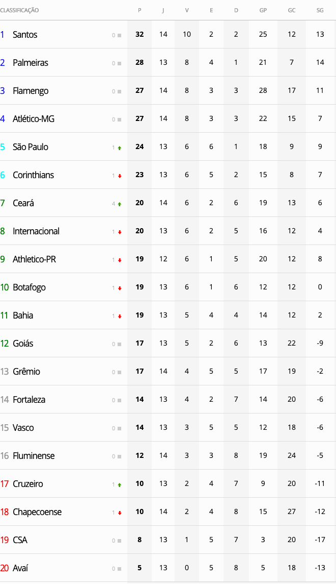 O Vasco, que enfrenta o Goiás neste domingo no Serra Dourada às 19h, segue em 15º lugar no Campeonato Brasileiro após os jogos deste sábado, pela 14ª rodada. Com os resultados, o Gigante da Colina não poderá ser ultrapassado.