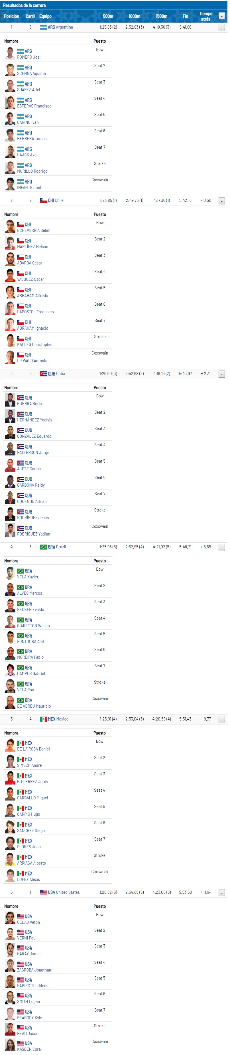 Na manhã desta sábado (10/08) foram concluídas as disputas das finais do Remo nos Jogos Pan-Americanos de Lima, no Peru. Com o vascaíno Alef Fontoura, o Oito Com do Brasil ficou na 4ª colocação na prova Final com o tempo de 5:48.21. O ouro ficou com o barco da Argentina, a prata com o do Chile e o bronze com Cuba. Outro vascaíno presente na prova, Alexis Lopez ficou em 5º lugar com o barco do México com o tempo de 5:51.43.