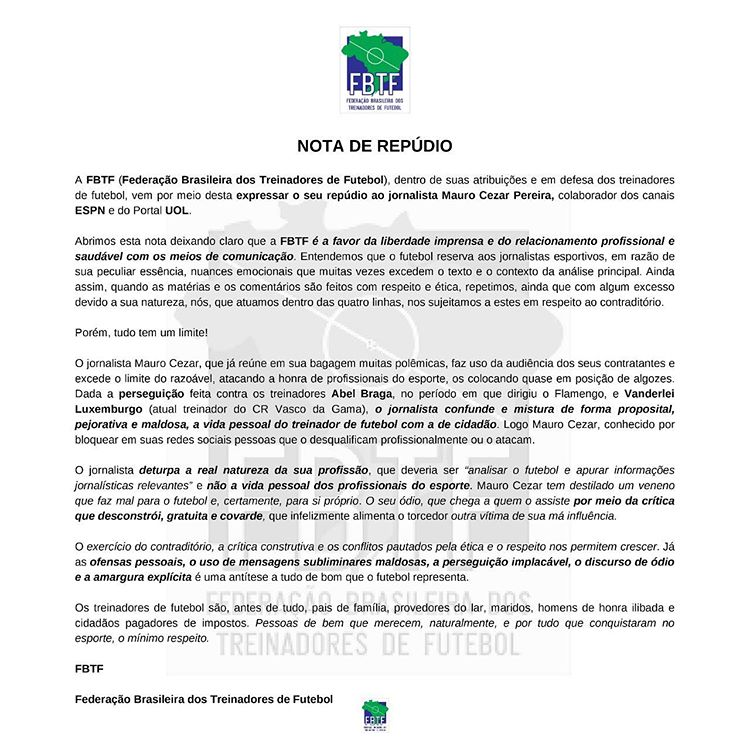 Federação Brasileira dos Treinadores de Futebol emite nota em defesa de Abel Braga e Vanderlei Luxemburgo