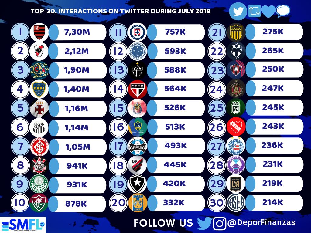 ⚽? Los 30 clubes de América con más interacciones en #twitter durante julio 2019. ???