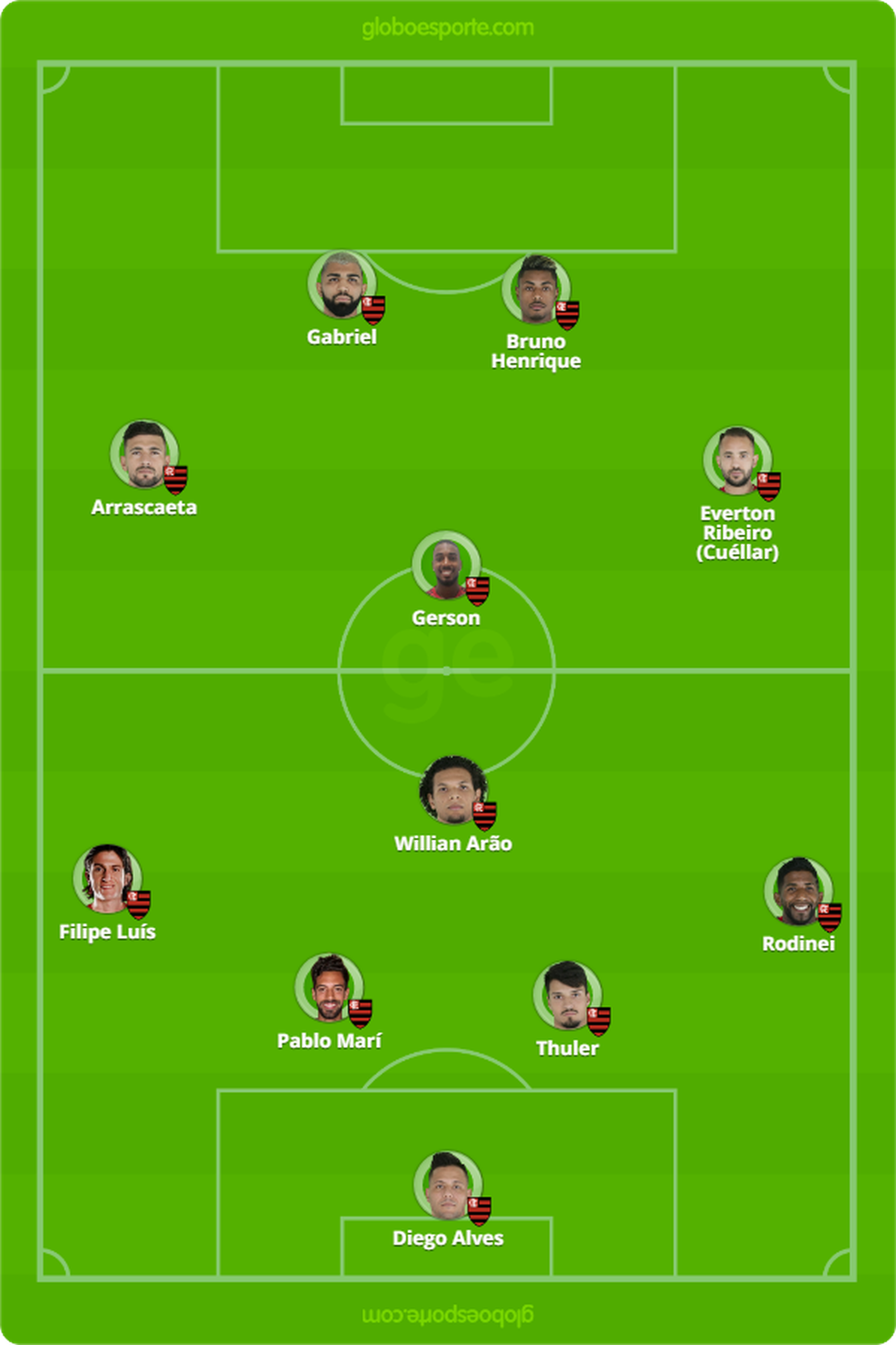 Sem o suspenso Rafinha, Rodinei é o substituto natural. A única dúvida está no meio de campo: manter Cuéllar ou voltar com Éverton Ribeiro. O colombiano tem futuro indefinido no clube, que avalia propostas do Al Hilal, da Arábia Saudita, e do Bologna, da Itália. Apesar do imbróglio, acompanha a delegação em Brasília.