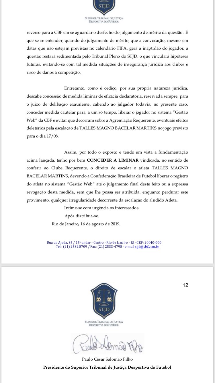 Eis o trecho do presidente do STJD, Paulo César Salomão Filho, concedendo a liminar a Talles Magno: