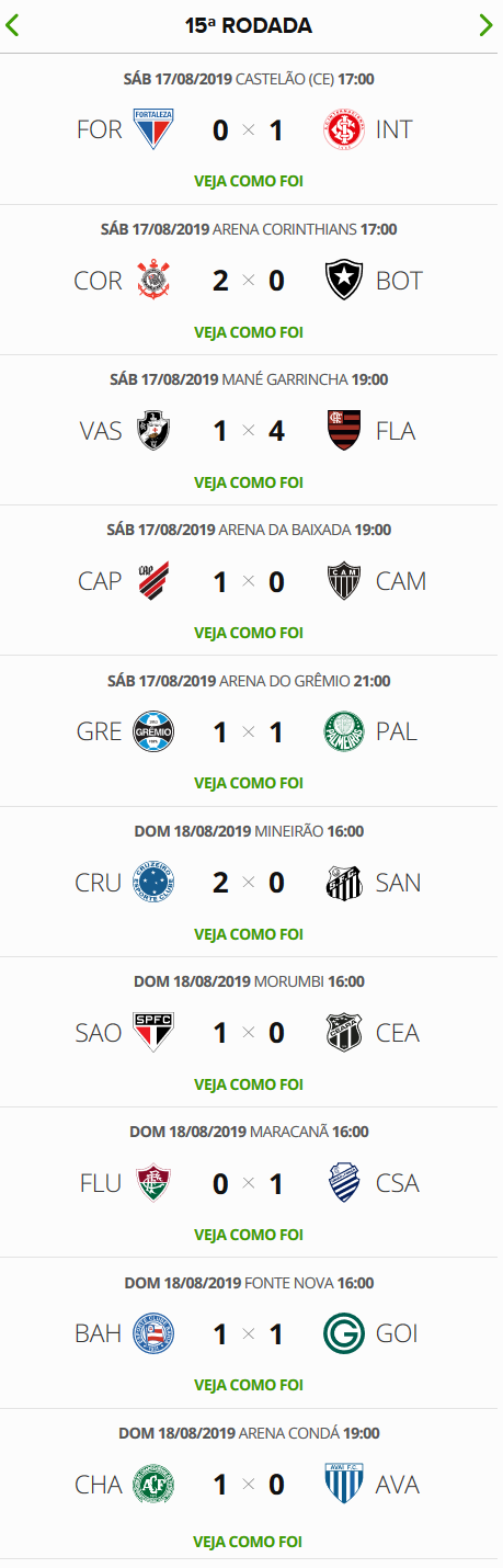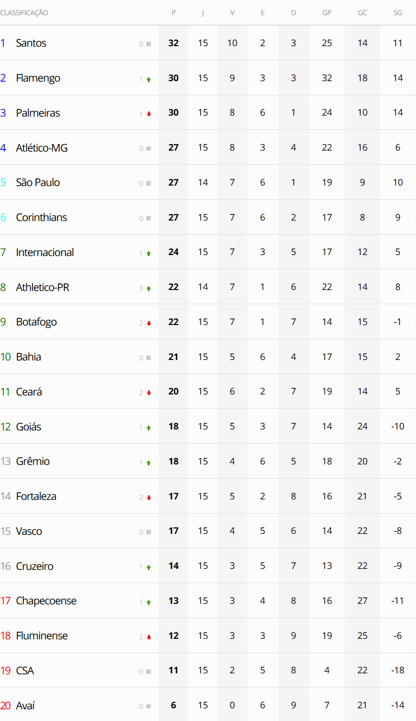 Terminada a 15ª rodada do Campeonato Brasileiro, o Vasco, que perdeu para o Flamengo por 4 a 1, segue na 15ª colocação.